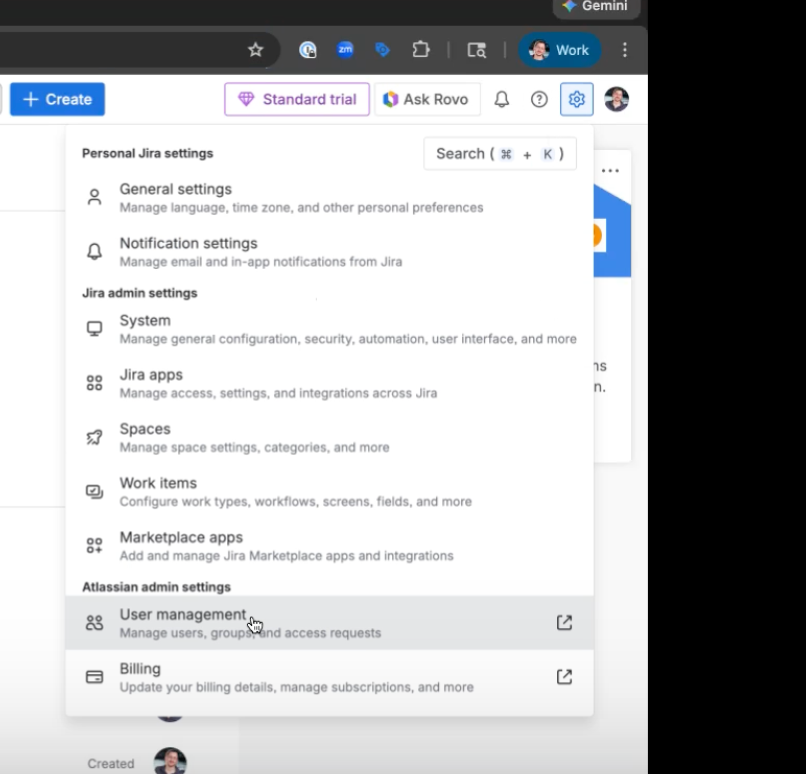 - Click the gear button on the top right of JIRA and navigate to User Management