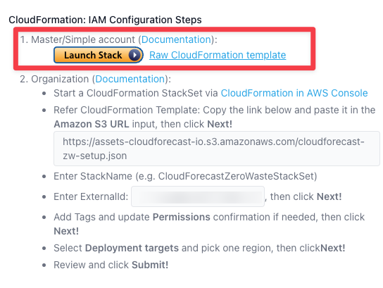- Master / Simple Account setup via CloudFormation Template – This will enable ZeroWaste permissions for one master payer account.